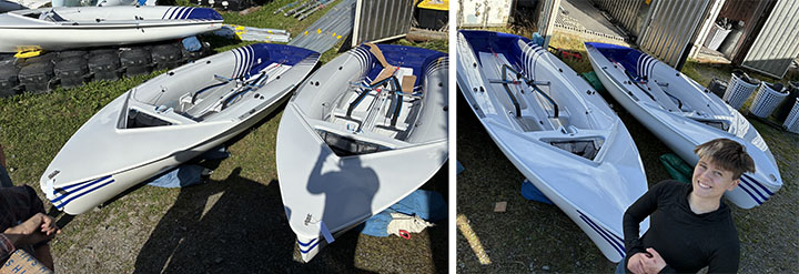 Over half of the JYS dinghy fleet was bought used from the Seattle Yacht Club in 1997, at our founding. Those boats are almost 35 years old. The others are from circa 2006 and pushing 20 years. The boats get used hard, and until the end of 2025, had to be stored outdoors over winter. They were delaminating, rotting, splintered, with broken parts and bent masts; and after years of ''just do what you can'' repairs, no two were alike anymore. This, along with the fact they were from different design generations, made parts replacements and maintenance very difficult, on top of all the hull problems. But thanks to the Juneau community, especially the Douglas-Dornan Foundation, JYS was able to incrementally expand its shipping container collection to three in 2022. And THAT meant we could store new dingies out of the winter weather if we replaced them. A three-year fundraising effort wrapped up in the Fall of 2025 when eight brand new, identical, Club 420 racing dinghies arrived -and were immediately placed into storage after seeing the light of day for just a few hours (it was the end of October, no time to waste!). They are waiting to begin a bright new era for this program when the 2026 season starts. [The aft deck stripes are real, but the ''bow stripes'' are just tape holding bow bumpers in place while the glue dries]